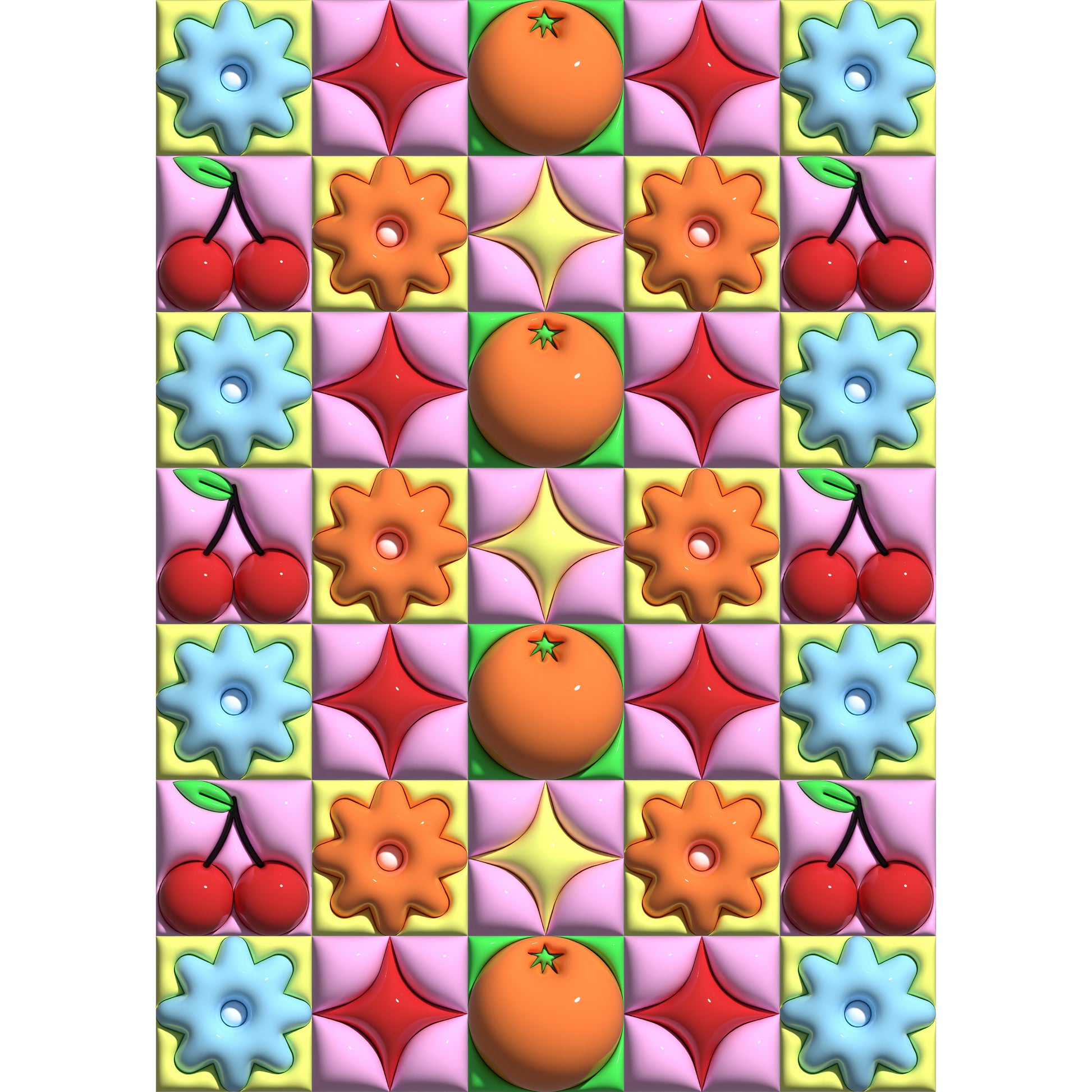 Featuring: blue and orange flowers, cherries, oranges, red and yellow stars.