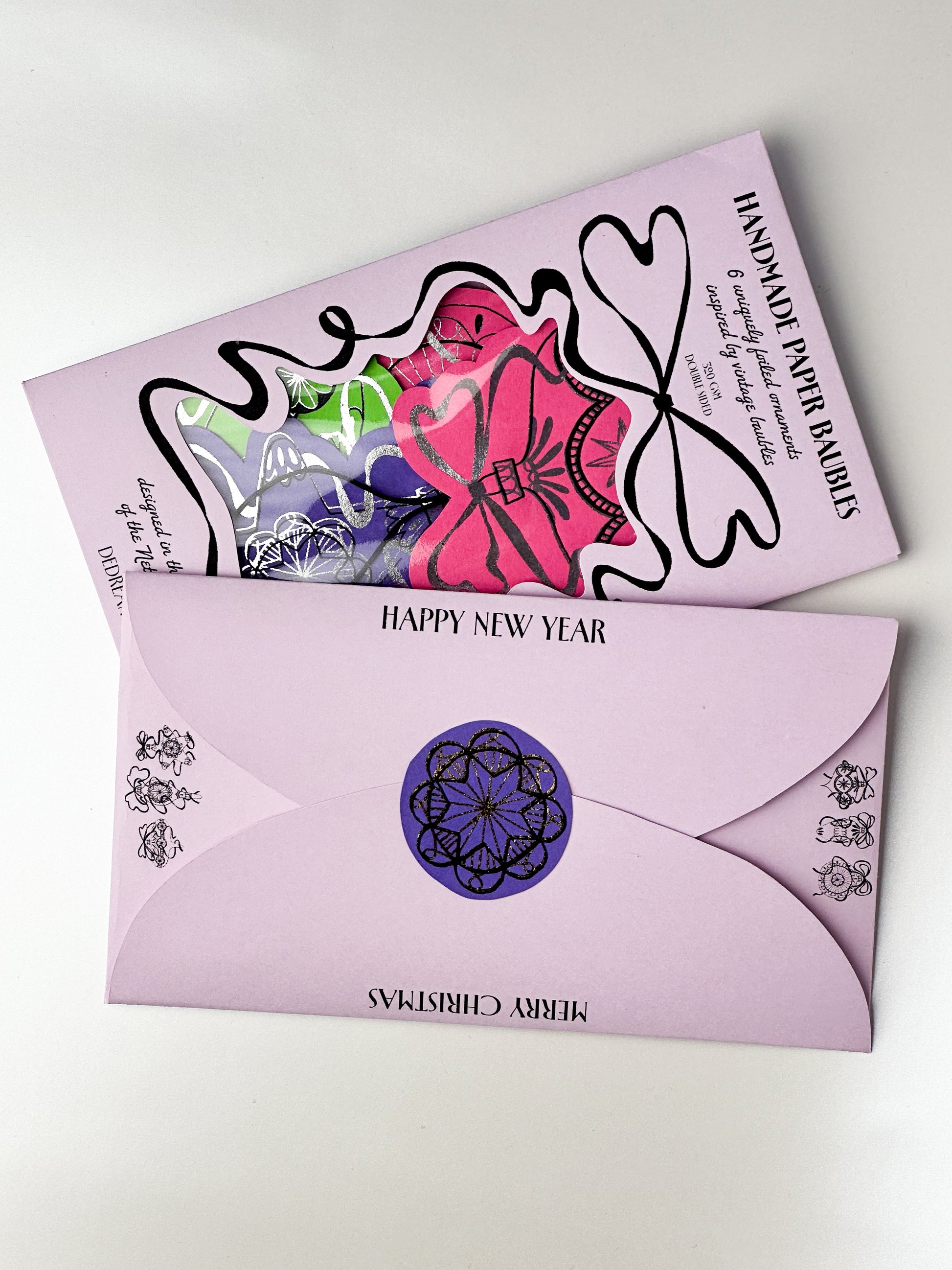 These paper ornaments started as fountain pen drawings in black and white. The layers were separated digitally to add the possibility of foiling while keeping their hand drawn quality.