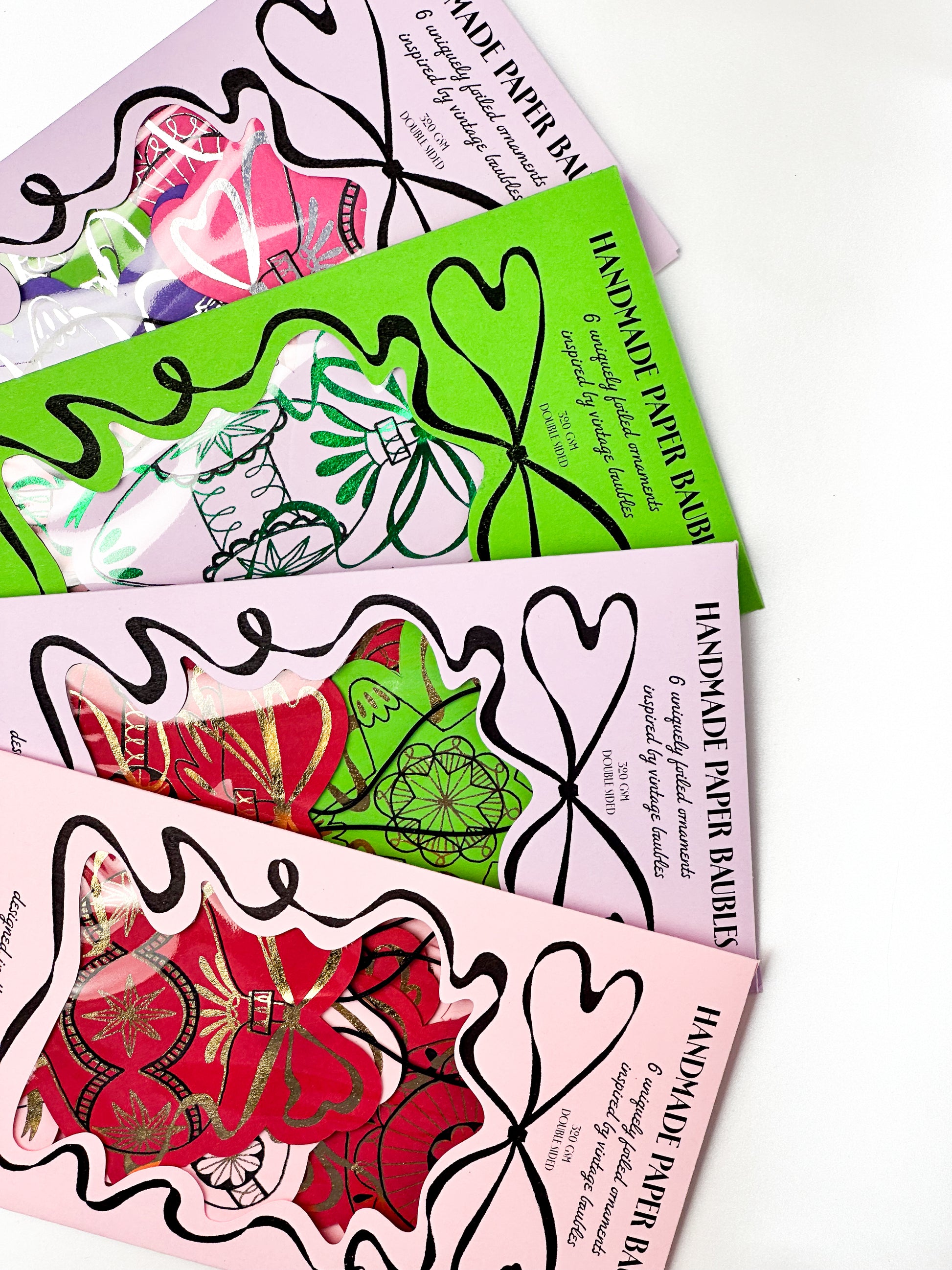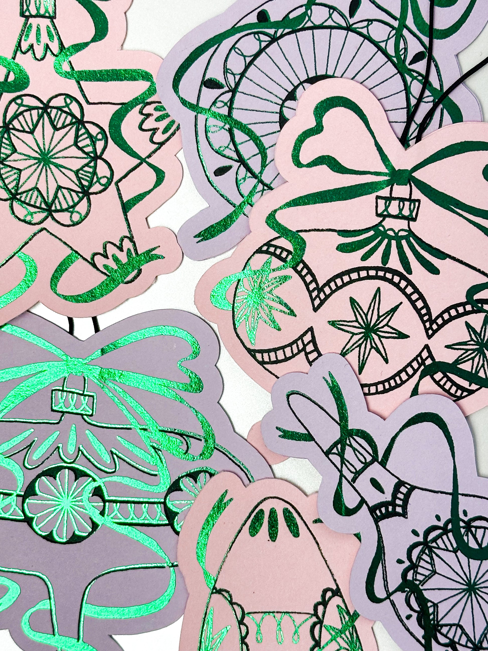 These paper ornaments started as fountain pen drawings in black and white. The layers were separated digitally to add the possibility of foiling while keeping their hand drawn quality.