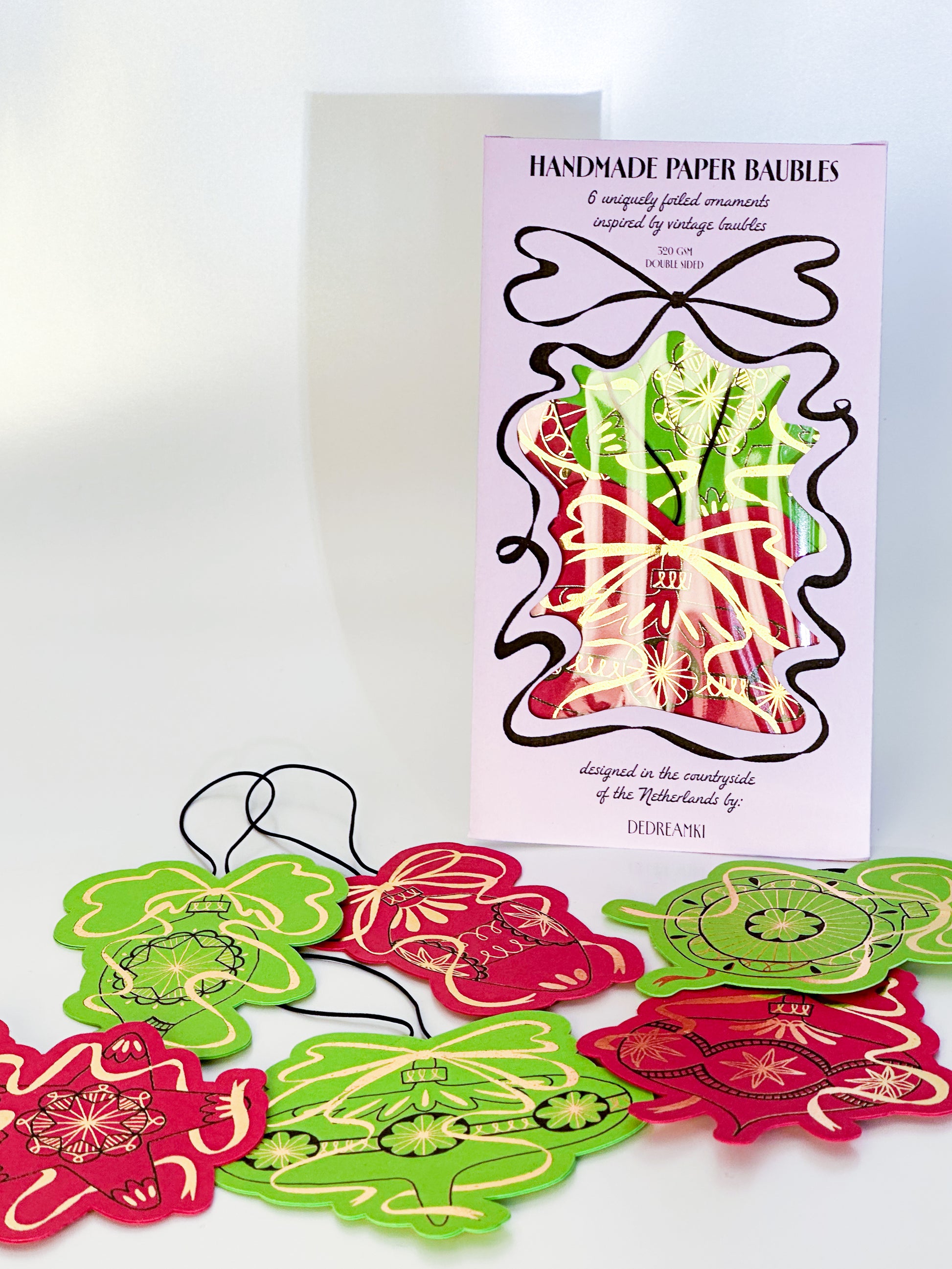 Bring a touch of christmassy nostalgia to your home with these "Handmade Paper Baubles": a set of 6 unique ornaments inspired by the timeless beauty of vintage Christmas baubles. Handcrafted from start to finish in the countryside of the Netherlands.