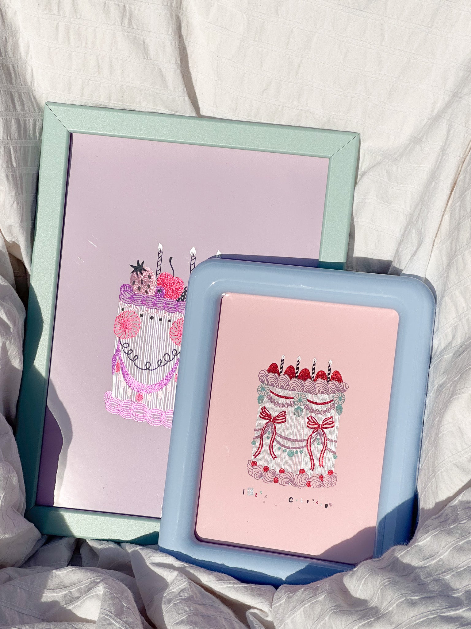 This series features three vintage cake designs, each design is hand-printed using a unique foiling technique that brings every colour alive one by one. The foil makes the artwork's colours shift and shine depending on the light and surroundings. At times they glow, at others they shimmer or soften; they're always captivating. This ever-changing finish makes these prints an interesting addition to your wall-art collection.