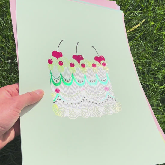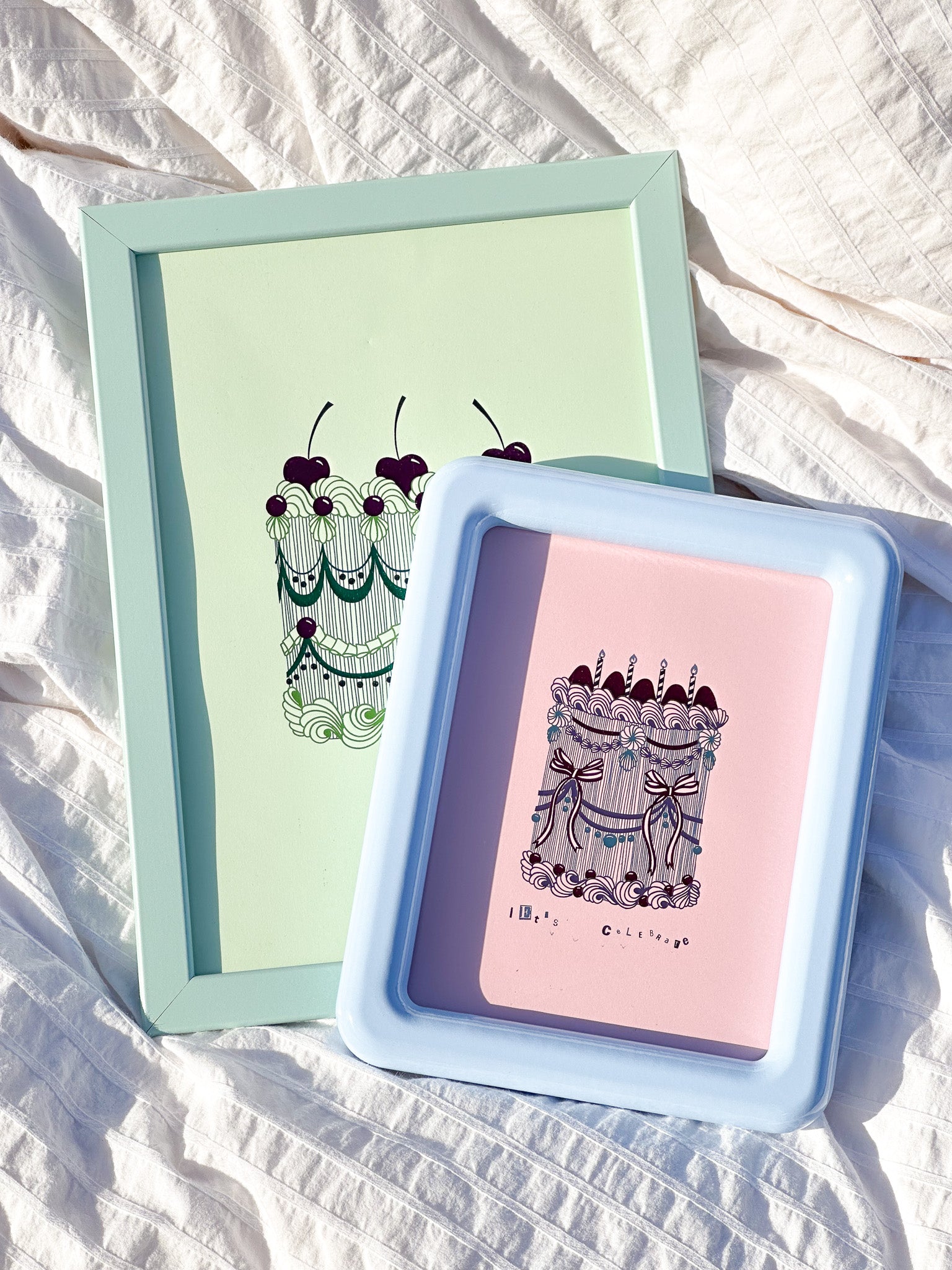 This series features three vintage cake designs, each design is hand-printed using a unique foiling technique that brings every colour alive one by one. The foil makes the artwork's colours shift and shine depending on the light and surroundings. At times they glow, at others they shimmer or soften; they're always captivating. This ever-changing finish makes these prints an interesting addition to your wall-art collection.