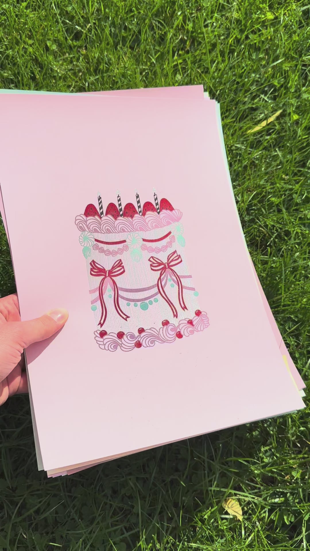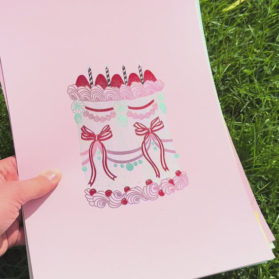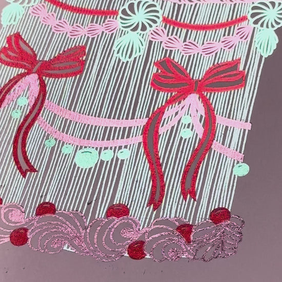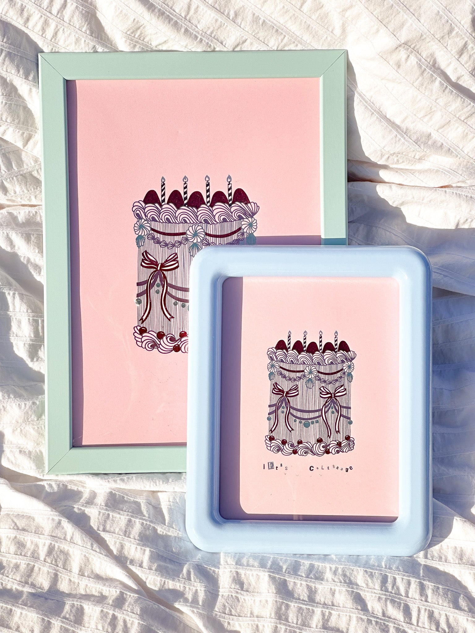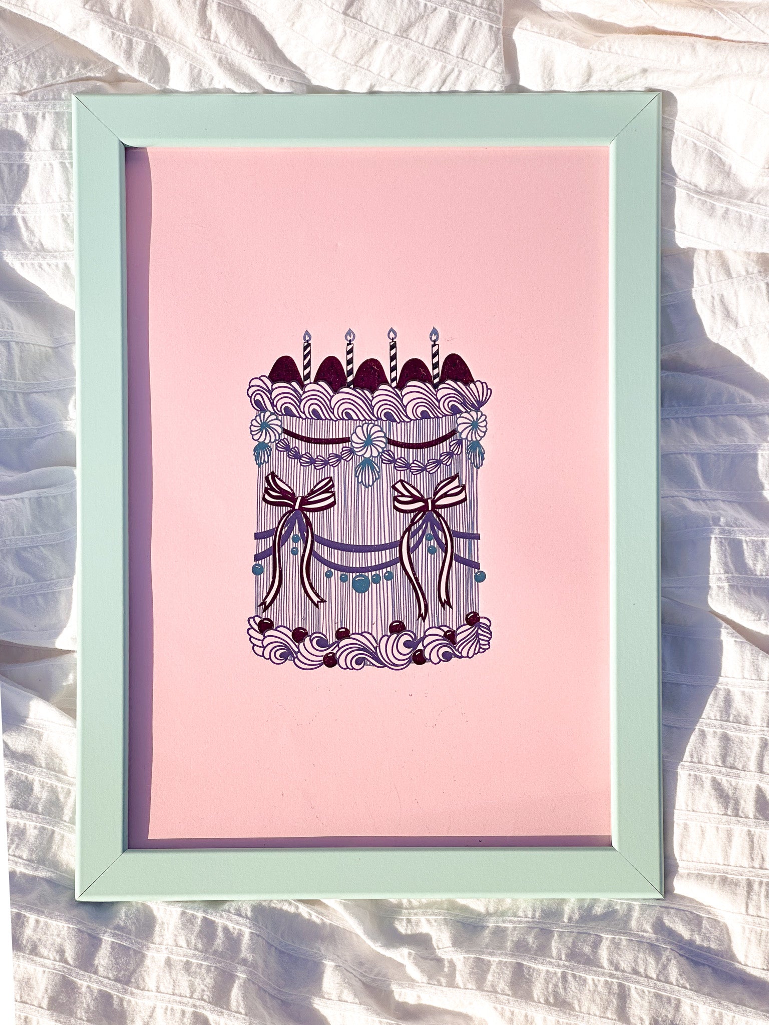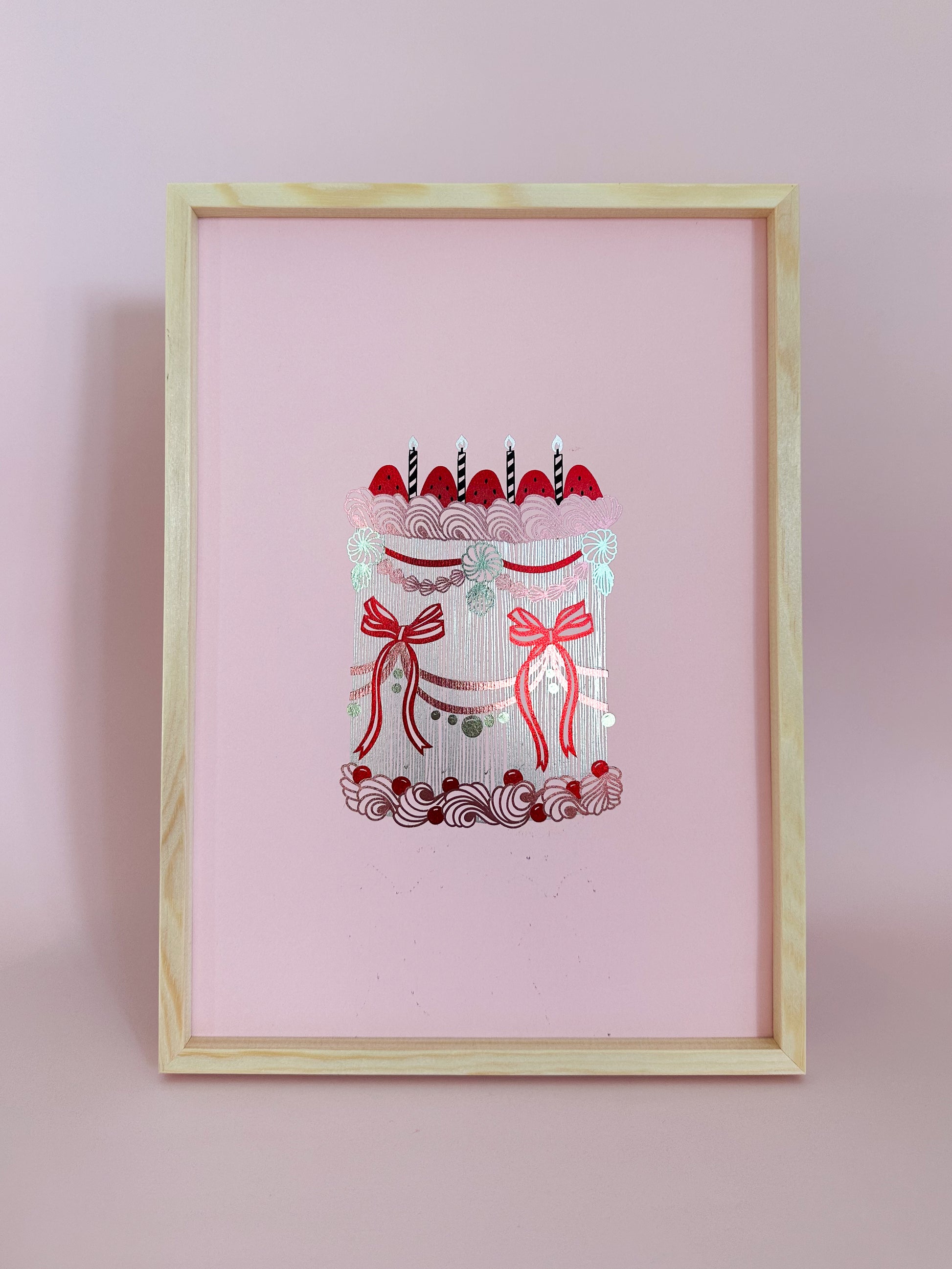 This series features three vintage cake designs, each design is hand-printed using a unique foiling technique that brings every colour alive one by one. The foil makes the artwork's colours shift and shine depending on the light and surroundings. At times they glow, at others they shimmer or soften; they're always captivating. This ever-changing finish makes these prints an interesting addition to your wall-art collection.