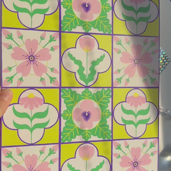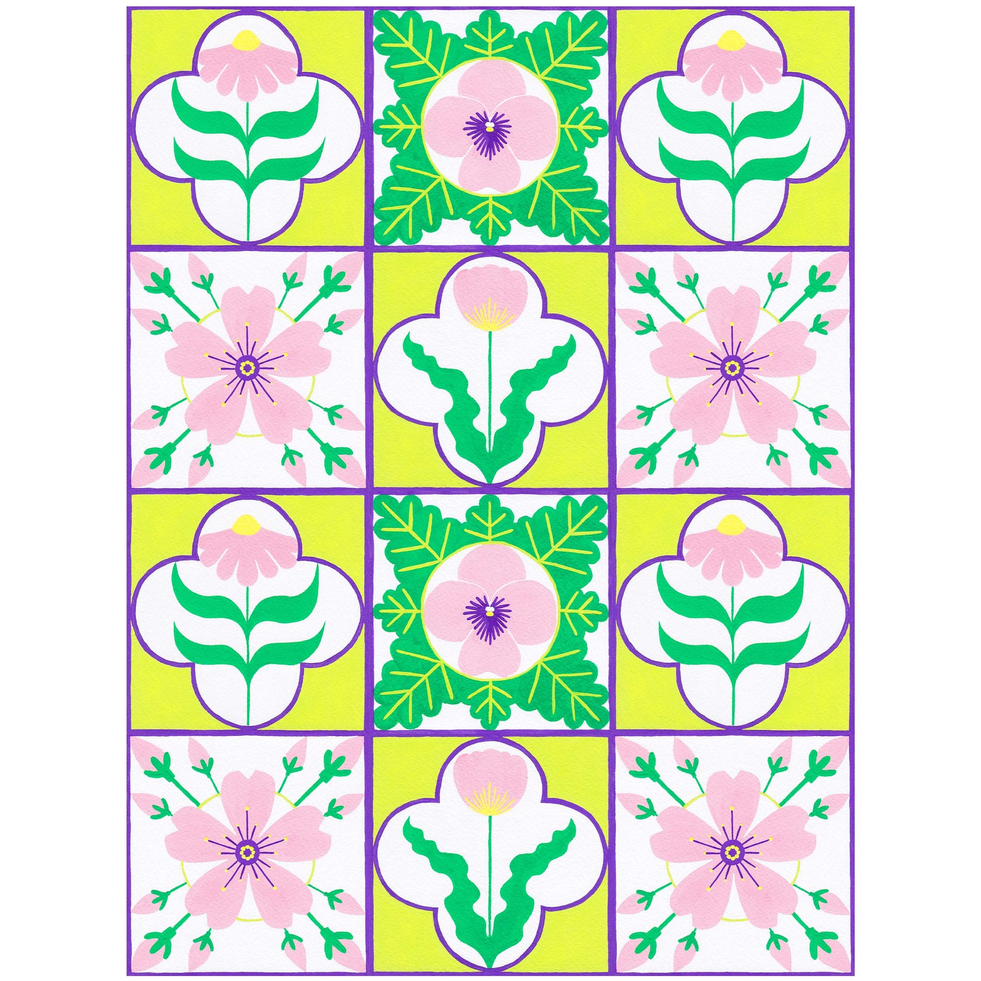 Four spring flowers are each expressed in their own decorative tile - the tulip, coneflower, pansy and cherry blossom. This floral art print celebrates the bright, fresh colours of spring and summer with vibrant greens and yellows, soft pink, whites and a deep contrasting purple. Inspired by traditional tile designs and painted in gouache, each flower tile was created individually and combined into a single composition. The fine art reprint preserves the texture of the original painting paper, giving a natural and high-quality finish. Perfect for adding a touch of botanical charm to any room!