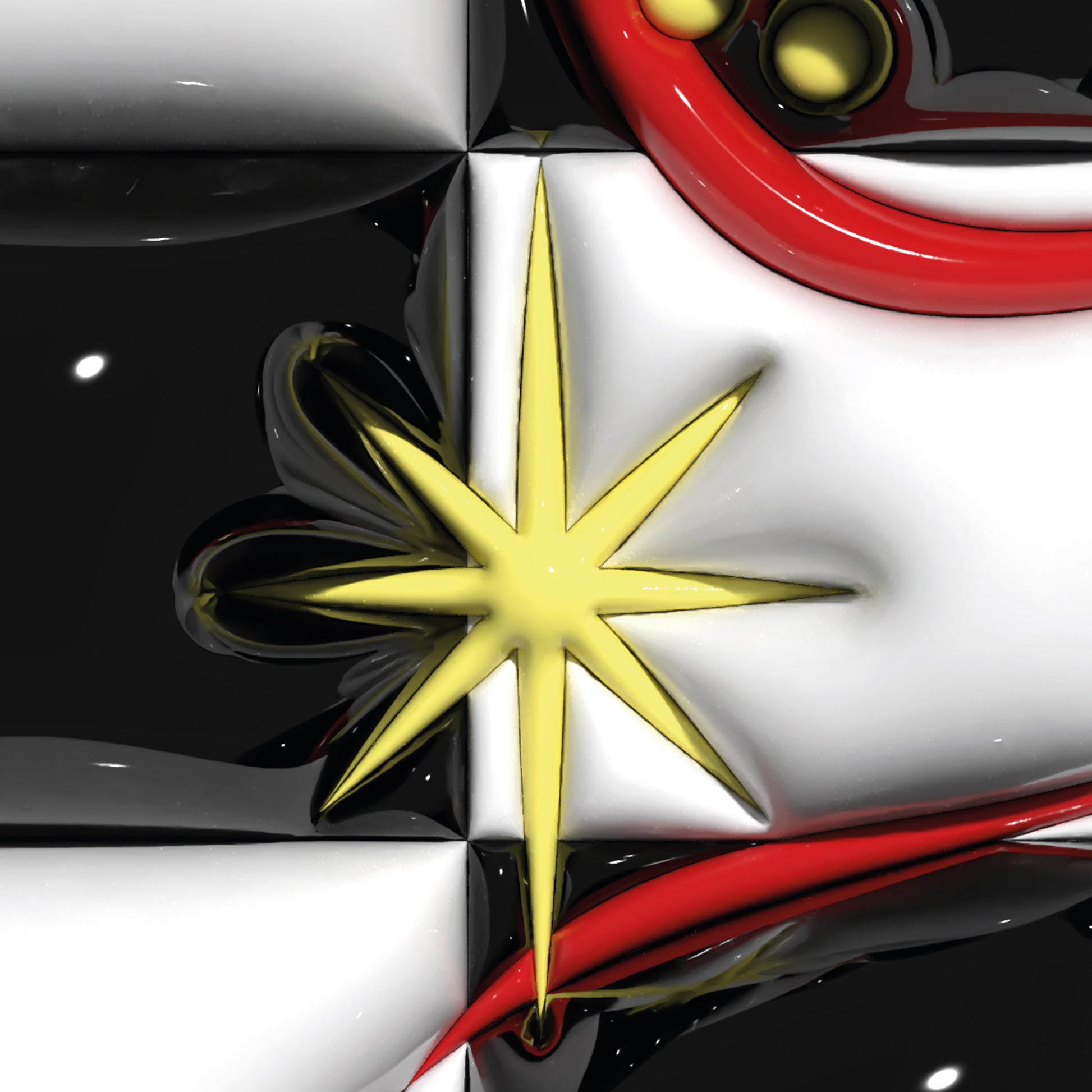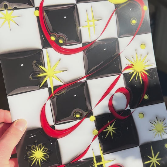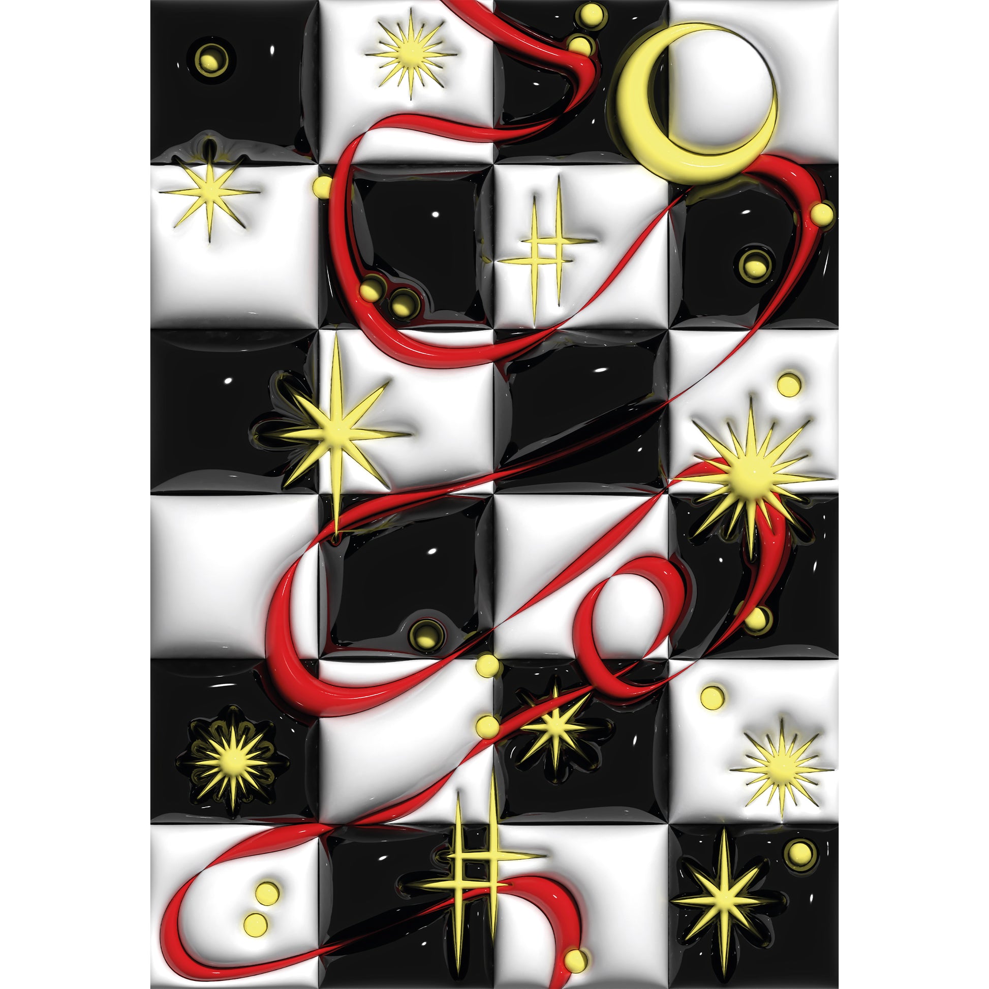 What goes great with a glossy texture? Sparkles! This print combines a starry sky with a checkered background, accented by a flowing red ribbon that adds a pop of colour. The intense black glossy look reflects the objects placed on top more clearly than any other print in the series.