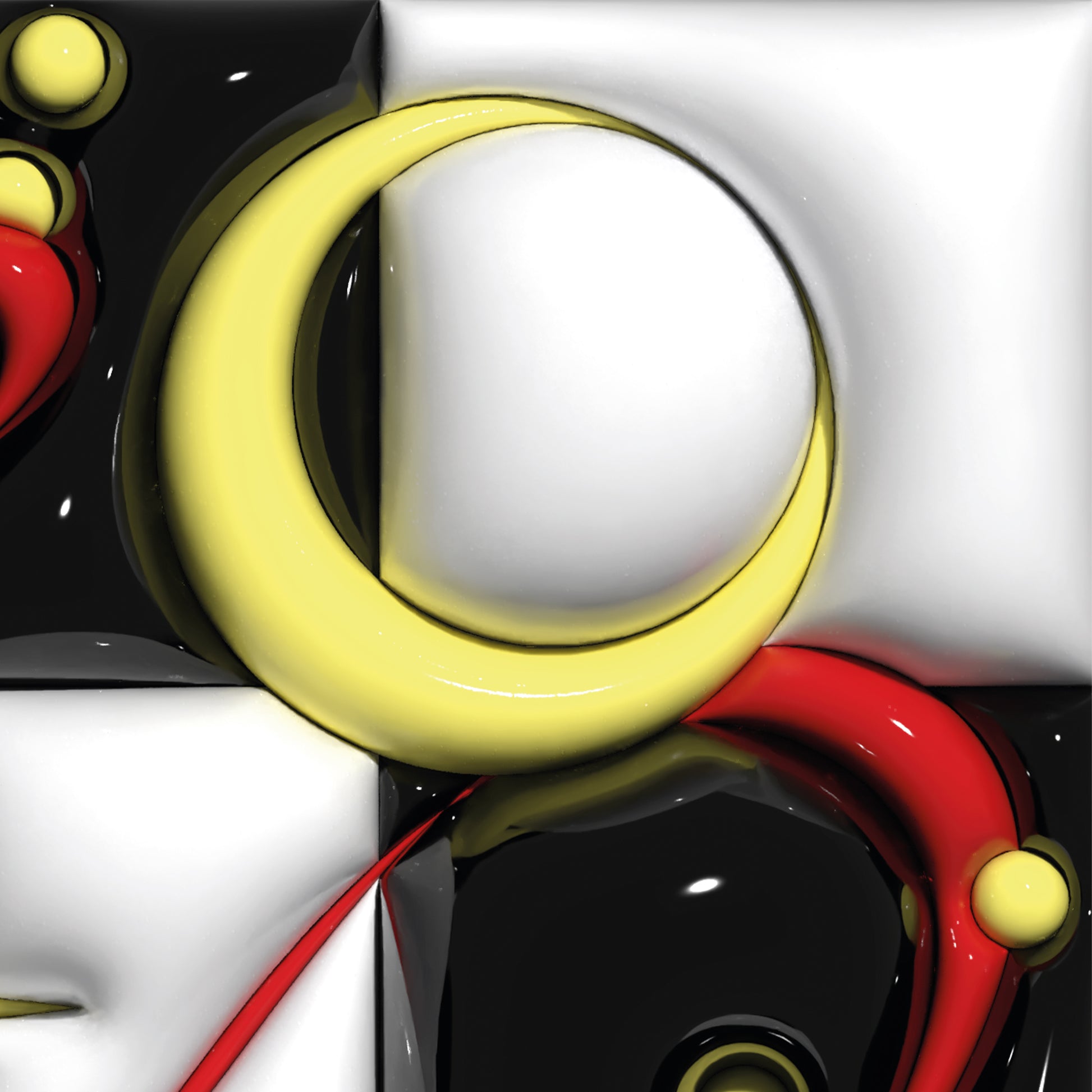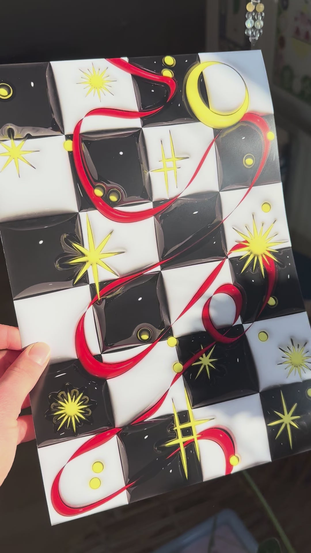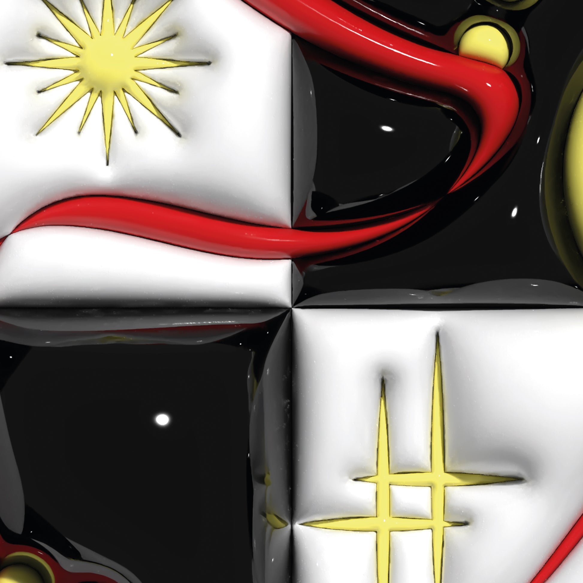 What goes great with a glossy texture? Sparkles! This print combines a starry sky with a checkered background, accented by a flowing red ribbon that adds a pop of colour. The intense black glossy look reflects the objects placed on top more clearly than any other print in the series.